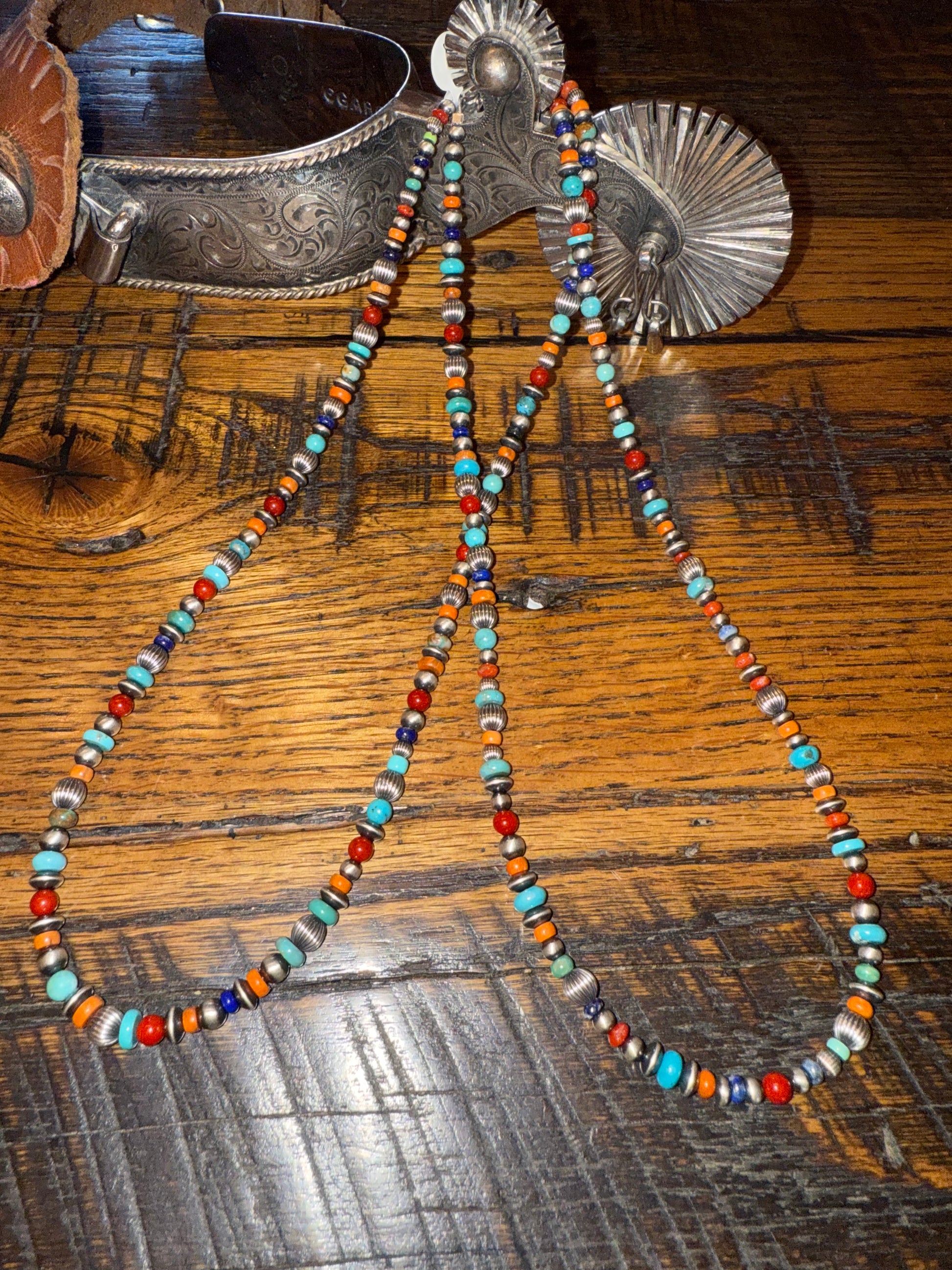 Sterling silver pearl necklace with serape colored beads. Measures 20 inches. One single strand necklace.