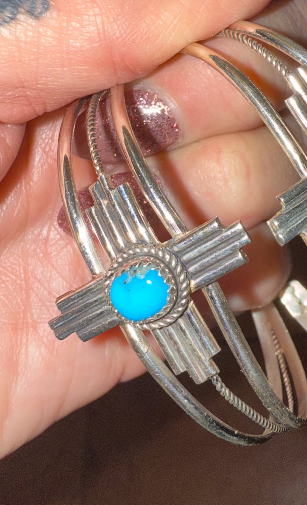 Navajo made Sterling Turquoise Zia bracelets ♥️ measures at center Zia setting 1.25 x 1.25 inches. Inside measurement of approximately 5.25 inches and a gap of 1 inch. Stamped sterling